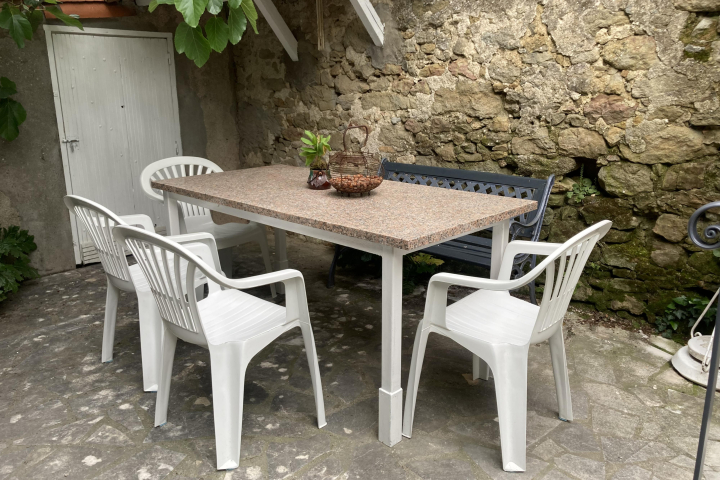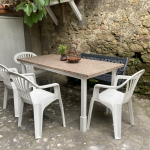 MOBILIER DE JARDIN : Une table en granit et 6 fauteuils de jardin sont à disposition pour prendre les repas à l’extérieur, en faire bon usage et les laisser en bon état de propreté.